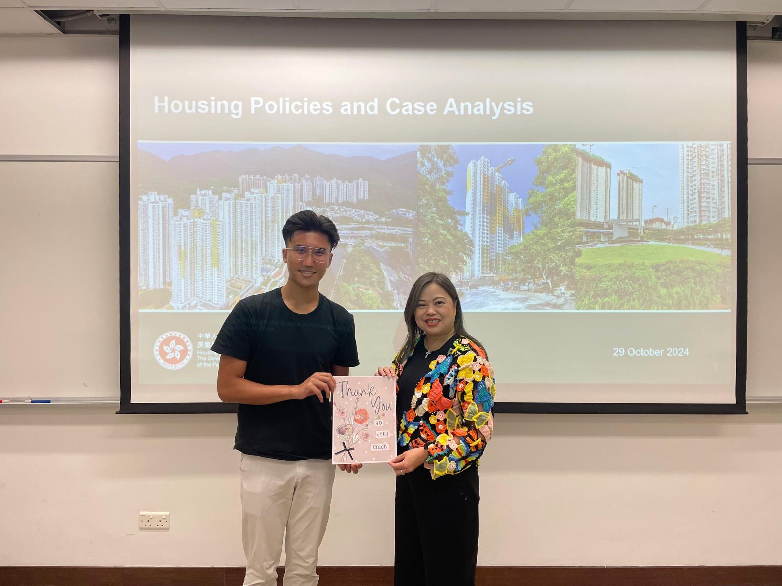During her sharing on October 29, 2024, as part of the MPUP5803 Topical Studies in Public Policy III’s lecture, Miss Law shared valuable insights on the 2024 housing policy. Her presentation covered critical aspects, including household distribution, policy objectives, and housing strategies. The session also highlighted the latest developments in Hong Kong’s housing sector, emphasizing the government’s efforts to increase housing supply by providing a range of diverse housing units and ensuring resource efficiency to meet the needs of various income groups. Additionally, the discussion focused on initiatives such as the Light Public Housing Project and Transitional Housing Projects, demonstrating the government’s proactive approach to addressing short-term housing gaps and assisting individuals needing immediate housing solutions.