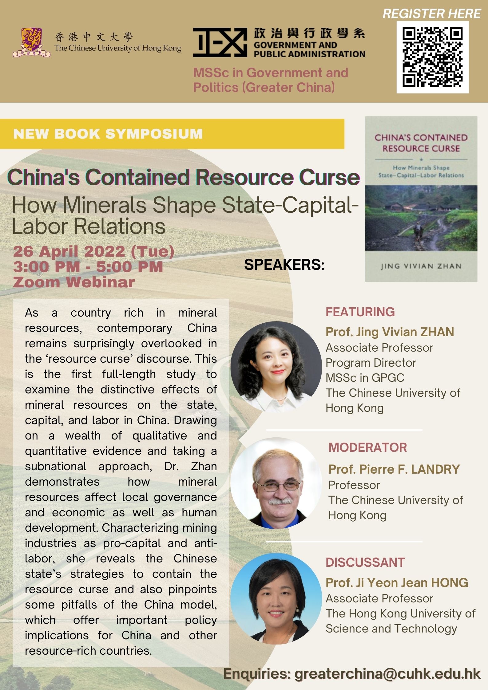 China’s Contained Resource Curse How Minerals Shape State-Capital-Labor Relations New Book Symposium Date: 26 April 2022 (Tue) Time: 3-5pm Format: Zoom Webinar Registration: https://cloud.itsc.cuhk.edu.hk/webform/view.php?id=13648184 Book Information: This is the first monograph on the socioeconomic and political impacts of minerals on contemporary China. This book takes a novel perspective on the resource curse by disaggregating […]